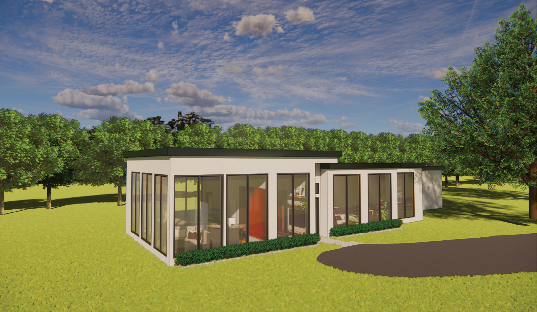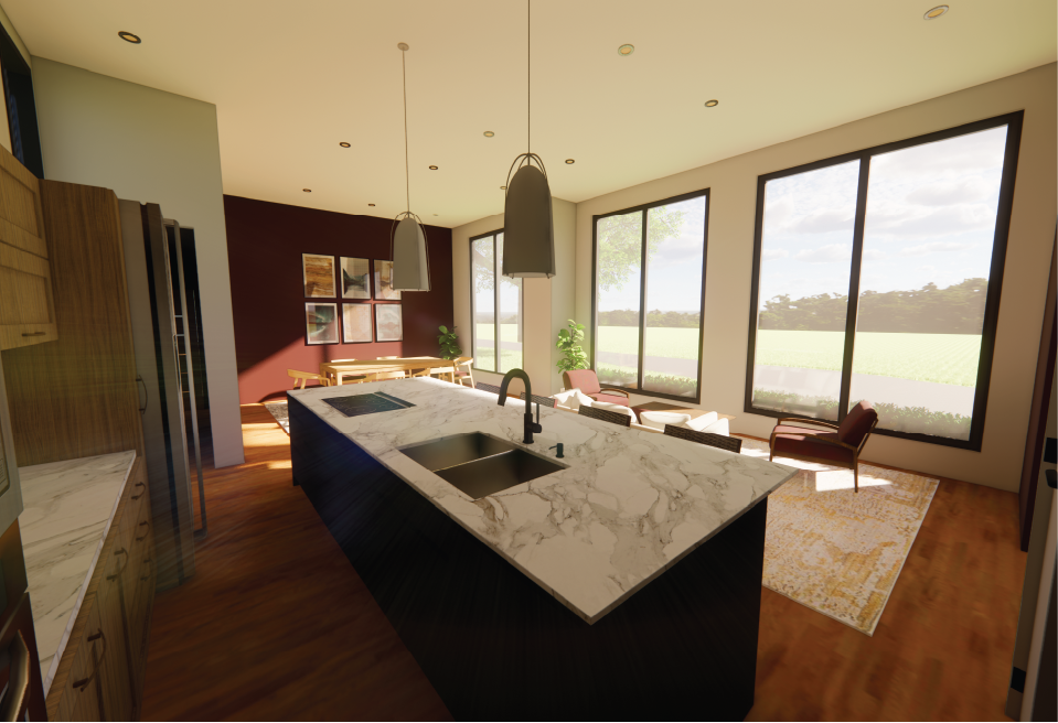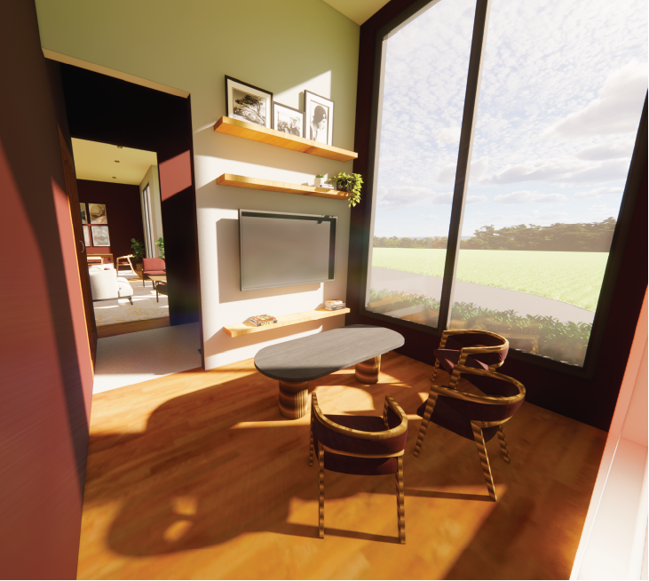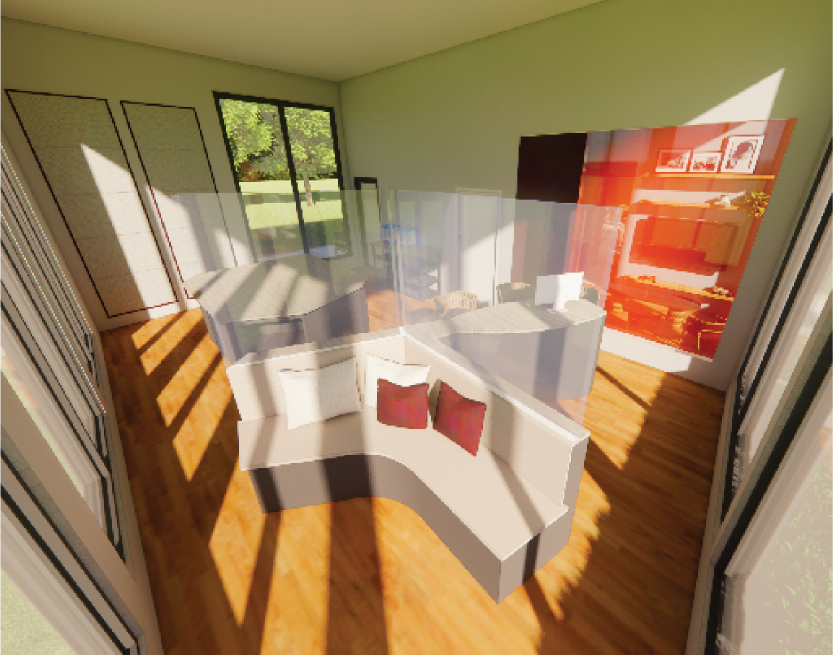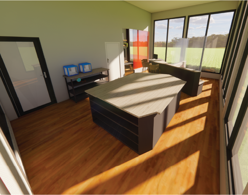 This work space was created to be used by a fashion designer who would need to take clients in her home. A large custom work bench was designed with shelving and cabinets for storage as well as a smaller table to hold 3D printers. Another work area includes a secluded seating area which faces the outside for ideation and inspiration. This also includes counter height seating with monitors to work on documents and edit work. A separate office area off the main enterance of the house features a large window and seating around a table with a screen to show work to clients. This office area is split off of the main work space using a 3Form wall, which offers privacy while also allowing a clear view of everything going on and bringing in a pop of color to the space.